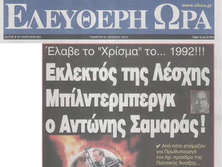 Εμείς εδώ να συμπληρώσουμε (εν έτει 2012 πια...) ότι με βάση τις πάντα άριστες πηγές πληροφόρησής μας ο Αντώνης Σαμαράς όντως συμμετείχε ΚΑΙ στη συνάθροιση της Λέσχης Μπίλντερμπεργκ που είχε λάβει χώρα από τις 6 έως τις 9 Ιουνίου του 1991 στο Μπάντεν της Γερμανίας.